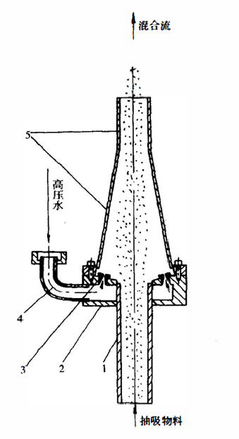 高压水射流某种程度上又叫做高速水射流,其速度接近lOOOm/s也是很正常的。利用高速水射流形成真空引射的特点,仿照水射流真 空泵的原理进行设计,真空喷头便成了高压水射流设备的一个附加功 能件,它以很低的成本在吸上和输送用途中可与射流真空泵相媲美。