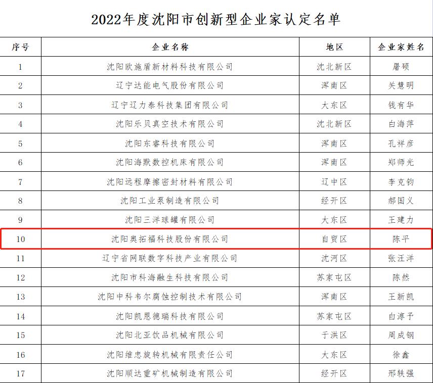 根据《深入实施“兴沈英才计划”加快推进新时代人才强市建设若干政策措施》(沈人社发〔2022〕12号)《沈阳市创新型企业家认定实施细则(2021年修订)》(沈工信发2021〔116号〕)精神,市工信局开展2022年创新型企业家认定工作及创新型企业家复核工作,经企业自主申报、区县工业主管部门推荐,市工信局委托第三方评审机构对2022年创新型企业家认定工作及创新型企业家复核工作进行评审,沈阳奥拓福科技股份有限公司董事长陈平成功入选