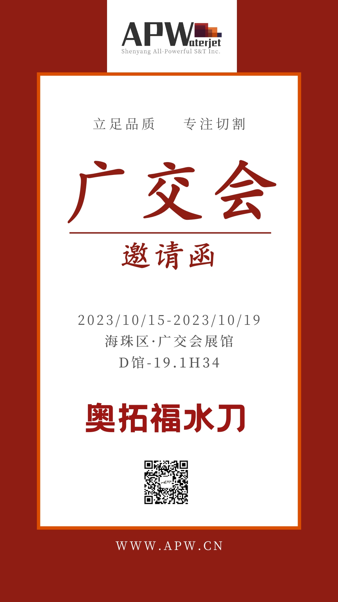 广州,2023年10月15日 — 第134届中国进出口商品交易会(广交会),奥拓福水刀即将成为其中一项备受关注的新兴科技。将吸引来自世界各地的参观者和采购商的目光,水刀技术还会在展会上展示其卓越的切割和加工能力。让我们一起相约广州,共享盛会。