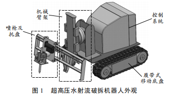 超高压水射流破拆机器人履带式移动底盘控制系统、机械臂架和喷枪及托盘4部分组成。