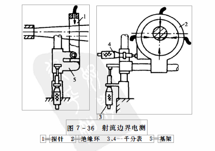 电测法如图7 - 36所示。 以4根不锈钢探针均布安装在绝缘环上,除针尖外,其他部分都有绝缘套。 绝缘环安装在基架上,并用两个于分表指示绝缘环的二维方位。 测量时,首先使射流轴心线与水平千 分表的中心线对正,并通过不断地调节使电路内的电流降到零,此时的 针尖位置就是射流边界。