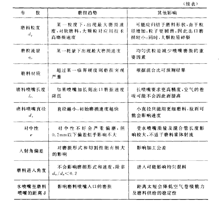 高速磨料粒子对喷嘴的磨损,性质上属于磨料磨损的范畴。 磨料 磨损包括有滑动磨料磨损、冲击破碎和高应力辗碎式磨料磨损、冲蚀磨 损等。 对磨料喷嘴的磨损起决定作用的是滑动磨料磨损,磨损的主要方式有微切削、微变形或疲劳。 它不仅与喷嘴的材料、形状有关,而且磨料的粒度、形状、硬度、滑动速度等都对其有影响,因此磨料喷嘴的磨损过程十分复杂。合理选择射流压力、磨料材质和粒度可有效地提高喷嘴的使用寿命;在设计和装配过程中,应确保水喷嘴和磨料喷嘴的对中性,以使射 流处于最佳位置,防止偏磨。