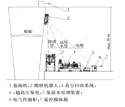 船舶除锈成套系统主要由超高压水射流泵组系统、真空抽吸排渣系统、自动爬壁除锈机器人以及控制系统构成。超高压水射流大功率泵组是产生超高压水的发生设备,采用三柱塞或五柱塞往复泵的结构形式,是大功率泵机组系统,是船舶壁除锈成套系统的重要组成部分,主要功能是产生超高压水射流,通过喷枪或清洗器等执行机构作用于船体表面,实现船体表面的除锈[3]。船舶除锈成套系统工作原理见图1。
