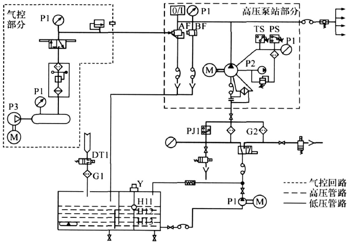 超高压泵站系统主要由超高压柱塞泵、电动机、弹性联轴器、气控调压阀、安全阀、压力继电器等组成。泵站整体设计要求结构紧凑、压力平稳、运行安全可靠;具有双层机械安全保护(安全阀、调压阀)和电气控制保护;超高压泵应采用强制冷却和强制润滑,并设有滑油温度继电器和滑油压力继电器,对泵站实现温度和压力的实时监控,确保超高压柱塞泵运行的安全可靠。泵站马力要求强劲,功率剩余20%。系统采用气控调压阀,可利用较小的气压实现超高压调节。超高压泵站液压原理见图3。