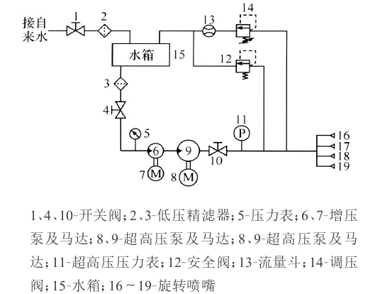 泵前水处理的主要目的是为超高压柱塞泵提供有压吸入的颗粒不大于10× 10- 3mm的工作介质,由于往复泵的吸入能力比较差,特别是对超高压大功率泵必须以相应流量的增压来提供强制吸入以保证流体的连续泵送,避免出现流量波动。为了避免超高压泵及管路中阀件的磨损和堵塞,要求输送到超高压泵的工作颗粒不大于10× 10- 3mm。
