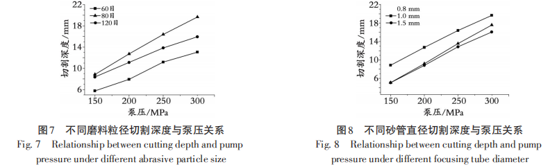 对比3种不同粒径磨料切割深度可以看出,80目磨料切割效果最佳,其次为120目,再次为60目。磨 料被卷吸入混合腔后,在混合腔内与水混合,一方面受水的牵引加速,一方面又在不断地相互碰撞消耗能 量。磨料粒径过小,相应磨料动能小,而磨料水射流冲蚀作用主要靠磨料,故导致其冲蚀材料的性能下 降;磨料粒径过大,粒子在混合腔内发生碰撞和磨损的几率增加,容易使粒子的能量发生损耗,导致切割 性能下降。试验条件下存在最佳磨料粒径,即80目。