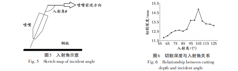 五轴联动后混磨料水射流切割设备可以实现对材料的倾角切割。为探究不同入射角下的切割性能, 将垂直切割时的入射角定为90°,取喷嘴前进方向与喷嘴出口射流的夹角为入射角,如图5所示。根据设 备性能,在60°~125°内每隔5°进行一次试验。靶距为4 mm,磨料为80目石榴石,砂管直径为1.0 mm,横移速度为100 mm/min,切割深度与入射角关系如图6所示。
