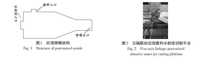 采用HSQ4020S五轴龙门水切割机。高压水发生器产生高压水, 通过极细口径的宝石水喷嘴进入混合腔,产生负压吸入磨料[7],混合之后由砂管喷出,对材料进行切割。后混喷嘴结构如图1所示,试验切割平台如图2所示,利用数控工作台可以精确改变横移速度、靶距和泵 压等参数。