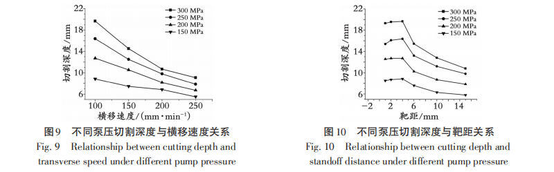 2.5 横移速度对切割深度的影响 靶距为4 mm,磨料为80目石榴石,砂管直径为1.0 mm,横移速度依次选择100,150,200,250 mm/min, 绘制不同泵压切割深度与横移速度关系曲线,如图9所示。