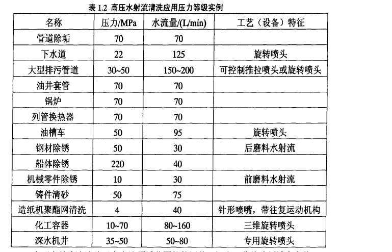 适用于高压水射流清洗的结垢物的类型包括各种机械堵塞物、各类盐碱结垢物、氧化铁、金属锈蚀物、油脂及油污凝结物、油漆、焦炭、石蜡、沥青、石灰、石子、沉渣、淤泥、船体上的附着物及海洋生物等。表为高压水射流清洗应用压力等级实例。