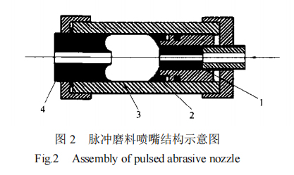 其中,脉冲磨料喷嘴如图 2 所示主要由上、下游喷嘴1,4和碰撞壁2、振荡腔3组成。