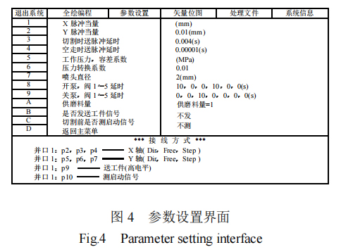 在切割之前,首先要设置好相关切割参数,如喷嘴直径、工作压力、磨料供给量(即磨料浓度)等,如图 4 所示。