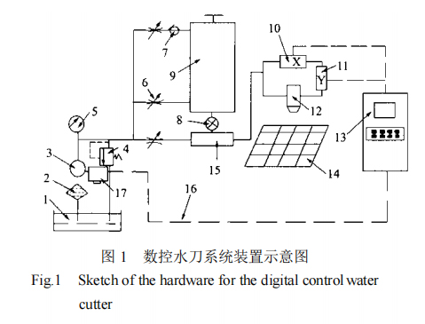 该数控水刀装置系统,具有人机交互方便、工作压力和切割比能耗较低、整套系统成本低廉等优点,而且能够实现机械切割设备难以实现的二维平面内的任意曲线加工,特别是在石材切割加工方面具有很好的应用发展前景。