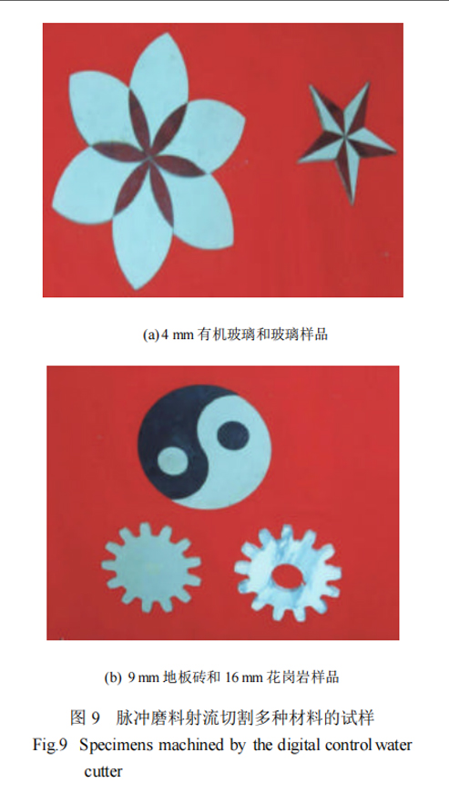 的切割深度是前混合式磨料水射流的 1.72 倍。同时在脉动状态下,也增大了射流的有效工作靶距范围图 9分别是试件为厚度 4 mm的有机玻璃和玻璃样品、9 mm 的地板砖和 16 mm 的花岗石的切割样品[8-11]。