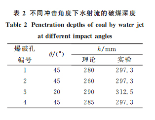 水射流出口压力为30MPa,潘三矿13-1煤体力学参数见表1,现场水射流冲击煤体实验情况见表2,高压水射流对煤体冲击入射角为θ。由于现场对煤体进行高压水射流水力扩孔实验,高压水射流可以反复冲击煤体,因此理论计算时将水射流重复冲击煤体的深度进行累积计算,对比现场和理论计算数值可以看出,理论计算结果与现场实验基本一致。