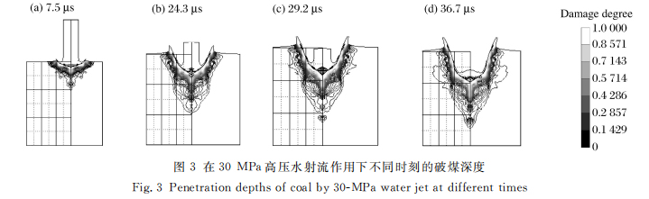 在30MPa高压水射流作用下,7.5、24.3、29.2和36.7μs时的破煤深度分别为0.7、2.2、3.5和 4.0mm,水射流的剩余长度分别为7.48、4.34、3.26、1.60mm,如图3所示[8]。将水射流出口水压 30MPa换算成水射流冲击煤体的初速度,并和表1所列的煤体参数一起代入式(22)~(23),得出7.5、 24.3、29.2、36.7μs时高压水射流的破煤深度分别为0.74、2.80、4.20和5.10mm,水射流的剩余长度 分别为7.41、4.17、2.93、2.15mm。这与数值计算结果基本符合,反映了本次理论计算的正确性。
