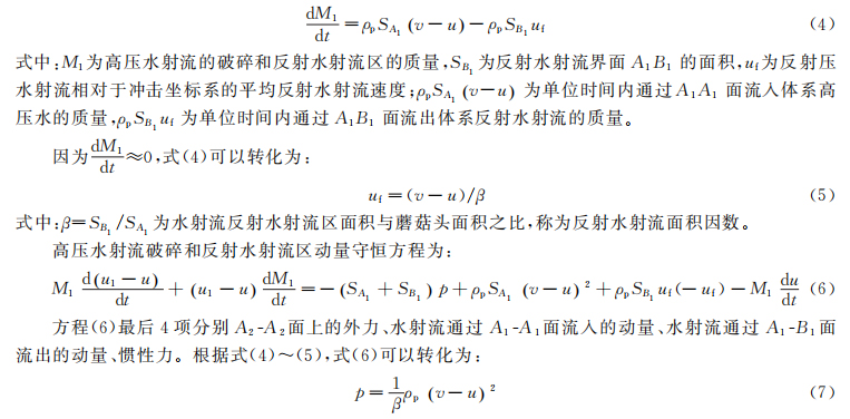 在忽略蘑菇头区质量时,未破碎高压水射流的质量守恒条件,即高压水射流的消蚀方程为: