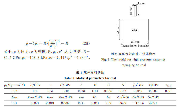 运用固流耦合的方法对煤体在高压水射流作用下的力学特征进行数值分析,水射流冲击煤体的具体尺寸如图2所示[8]。煤体采用含损伤J-H-C本构模型,煤体力学参数见表1,其中ρ为密度,G 为剪切模量,E 为杨氏模量,ν为泊松 比,A、B、C、N、D1、D2、K1、K2为材料常数,fc为单轴压缩强调,T为极限拉伸静水压力,efmin为损伤常数,Smax为量刚一强度,pcrush破碎静水压力,mloc为最大体应变,mcrush为破碎体应变;plock为最大静水压力。对水射流采用状态方程: