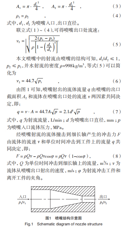 本文中的射流由喷嘴射到空气中属于非淹没流体,射流由喷嘴的入口端流入,出口端流出,如图 1 所示。假设流体在喷嘴中连续流动并不可压缩,应用粘性流体的伯努利方程可以将流体表示为