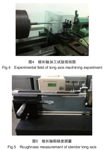 本文首先任选一组细长轴进行普通车削加工,加工完成后采用 JB-1C 型粗糙度测量仪对其初始端及中间位置的表面进行粗糙度测量;再将细长轴按照本文提出的射流辅助支撑方法进行加工,车削加工完成后同样其在同一位置进行粗糙度测量,测得的结果分别由打印机打印出来。细长轴加工试验现场图如图 4 所示,粗糙度测量图如图 5 所示。