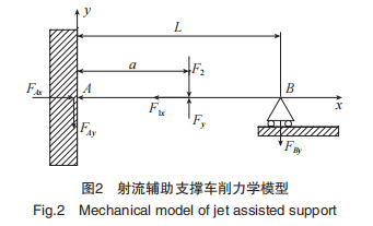 本文中细长轴采用的装夹方式为顶针式。根据该装夹方可知细长轴的受力模型可以简化成工程上的超静定梁问题,简化后的受力模型如图 2 所示。卡盘对细长轴的约束可以简化为 FAx、FAy 和弯矩 MA ;车刀在 xoy平面对细长轴产生的切削分力简化为 F1x、Fy;射流对细长轴产生的冲击力简化为 F2 ;顶针对细长轴的约束简化为支座约束反力 FBy。