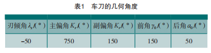 为了验证本文提出的以射流辅助支撑抑制细长轴振动的有效性,分别选两组细长轴分别进行有无射流辅助支撑加工的实验。细长轴的毛坯尺寸为 ,材料为 45 号钢。试验中采用的加工参数如下:背吃刀量ap=0.2mm,进给量 f =0.1mm/min,切削速度 Vc=60m/min ;切削液射流发生系统中的参数如下:泵压为 P=6.5MPa,喷嘴直径d=2mm,喷距 L=1mm;采用的刀具是硬质合金车刀,刀具具体几何角度如表 1 所示。