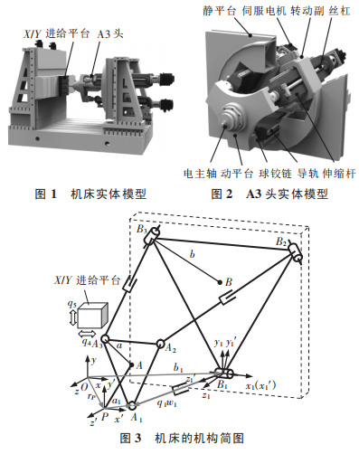 五轴机床实体模型如图 1 所示,由三坐标动力头(如图 2 所示 A3 头)和 2 自由度 X/Y 平台构成。 A3 头的拓扑类型为具有一平动两转动的 3-RPS 并联机构,基于该动力头的五轴机床适用于大型航空结构件的高速加工[5]。图 3 所示为基于 A3 并联动力头的机床机构简图。其中,Ai 和 Bi(i=1,2,3)分别为各支链球铰链和转动副的中心,并构成外接圆半径分别为 a 和 b 且形心分别为A 和 B 的正三角形。 P 表示刀具参考点, 且有 AP⊥△A1A2A3,向量AP 的模为 e。 建立固定参考坐标系 O-xyz和刀具连体坐标系 P-x′y′z′,建立支链固定坐标系 Bi -xi yizi 和支链连体坐标系 Bi-xi′yi′zi′,xi轴与 xi′轴重合。