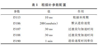 Turbo PMAC 进行粗插补时将给定的 NC 代码轨迹按时间进行细分,粗插补根据 NC 代码的模态选择直线或圆弧插补方式,分段时间(粗插补周期)由专门的变量设置, 为避免运动轨迹混合 时的加速度 冲击,采用梯形加速度规律进行速度轨迹段的过渡,梯形加速度的匀加速运动时间和变加速 时间由专门变量给定,五轴加工进行的是点与刀具轴线矢 量的同步插补,当点的位置保持不变时,Turbo PMAC 采用预设好的默认进给速度。 表 1 给出了粗插补参数的配置。