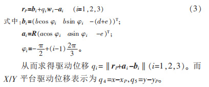 式中:ψ,θ,准———进动角、章动角和自旋角。联立式(1)和式(2)即可求出 ψ 和 θ。设刀具参考点 P 相对于固定坐标系 O-xyz 的位置rP=(xP yP zP)T,显然 zP=z。 对于 3-RPS 机构,当已知动平台 ψ,θ 和 zP 三个参数时,依据连带运动分析[7],即可