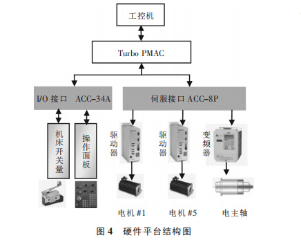 以 “工 业 控 制 计 算 机+可编程 多 轴 运 动 控 制 器(Turbo PMAC)”的开放式结构为核心,采用 标准化总线技术搭建的五轴联动机床运动控制的硬件平台如图4 所示,工控机和可编程多轴运动控制器通过 PCI 总线相连接,构成双 CPU 的实时、多任务主从控制结构[1]。