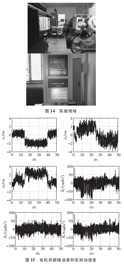 通过 CAM软件生成加工 NC 代码导入自主开发的软件平台进行编译、校验。图 14 为实验现场,机床按恒定进给速度加工, 切削件为尼龙材料的方块, 以50ms 采样周期实时采集电机的运动信息。考虑到机床并联机构部分(3-RPS结构)的对称性,仅分析其中支链 1 电机运动信息。如图 15 所示电机跟随误差和实际加速度信息,ε1,ε4,ε5 分别表示支链 1,X 平台,Y 平台电机的跟随误差,θ1,θ4,θ5 分别表示 支 链 1,X 平台,Y 平台电机的实际角加速度。机床各伺服电机的每圈脉冲数为 10 000,图 15 表明在高速进给加工时,电机跟随误差在 4 个脉冲之内,考虑丝杠传动和减速比, 反应到末端的轮廓误差在 1 μm 之内,满足实验平台的轨迹控制精度要求。 电机实际角加速度基本控制在-50~50 rad/s2,未出现明显角加速度冲击和震荡,实验数据表明伺服电机控制参数调节的有效性。
