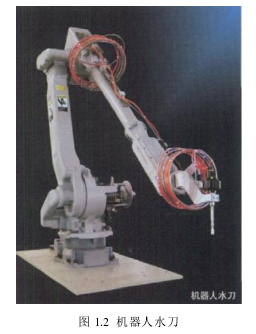国外的水刀切割技术大约产生于 20 世纪 60 年代,它主要应用于冲蚀土壤和采矿等;在 70 年代末,美国推出了超高压水切割机,此时水切割技术向着高压水切割的趋势在发展;大约在 80 年代中期,磨料水切割机(加磨料的水切割技术)已经广泛应用于工业现场[8]。目前,国外的有关水切割设备公司中,比较出名的有日本的松野机器公司、英国的 Desith 公司、及美国的 Flow Systms 公司。其中美国的 Flow Systms公司生产的超高压水切割数控系统中开发了 CAD/CAM 软件系统,实现了对复杂轮廓的自动编程和加工操作的功能。目前,国外的先进技术主要是研究五轴或是六轴的水切割数控机器人结构机床及离线自动编程技术,这种结构的机床主要用于小型汽车的内饰件的加工,功能比较强大[9~10]。然而,由于机器人机床结构比较复杂且造价比较昂贵,所以在各行各业中的推广应用比较困难。 国外的水切割技术已经发展的比较成熟,然而我国对水切割技术的开发与研究起步较晚,一直到 20 世纪 80 年代才开始进行专门的研究。我国最早投入到水切割机开发与应用的有南京大地水刀股份有限公司,该公司于 1996 年成功的研制出了第一台水切割机,打破了水切割机领域被国外少数公司所垄断的局面,标志着我国“水切割”技术的应用起步[11]。2002 年成功研制了中国第一台超高压水切割废弹药销毁系统,2004 年成功研制了国内首台超高压空间水切割系统[12]。目前,国内有专门生产数控高压水切割机床的公司,如南京大地水刀、浙江兰岩浙臣、上海维宏等水刀切割设备公司。近几年,国内的水切割技术在吸收世界先进水切割技术的同时,不断开拓创新,努力学习和发展新技术并将其应用于新的领域。目前已有或在开发的新技术有: (1)水刀加工中心。将切、铣、磨等多个功能集成于一体的水切割数控机床。 (2)“废旧弹药销毁”水刀。由于水切割属于冷态切割,所以适用于易燃易爆产品的切割,且不会引爆产品,进而达到安全的销毁过期或是无用的弹药的目的。 (3)空间曲线切割水刀(机器人水刀,如图 1.2 所示)。机器人水切割系统现在主要被应用于汽车内饰件切割,可以切割任何空间曲线,功能比较强大。 (4)五轴水刀。虽然通过机器人水刀机床可以解决切割斜度的问题,但仍存在精度的问题,不适用于需要高精度产品的切割。所以为了达到无斜度且精度较高,还需研究五轴联动水切割机床。 (5)新开发的 CAM 软件在数控水切割机床中的应用。对于水切割数控机床而言,需要根据水切割加工工艺,编制专用的数控加工 G 代码,直接驱动机床轴的运动。CAM 模块就是根据给定的二维图形及水刀工艺参数,自动生成数控加工代码,有效的提高了辅助设计及切割效率。 (6)大型多头高精度水切割机床。