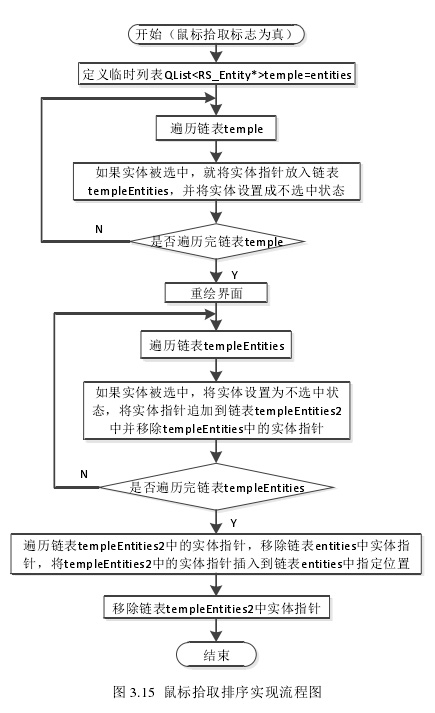 temple Entities 是否为空),若是,就遍历链表 temple Entities2 中实体指针,移除链表 entities 中的实体指针并将链表 temple Entities2 中实体指针插入到链表entities 中。整个鼠标拾取排序操作的流程图如图 3.12 所示,鼠标拾取排序前后的效果图分别如图 3.13 和图 3.14 所示,代码实现的流程图如图 3.15 所示。