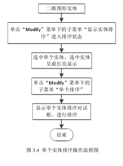 单个实体排序,即一次只能对一个实体进行排序操作。首先要进入实体排序状态,然后选中单个实体,“单个排序”按钮才会被激活,单击“单个排序”按钮,弹出单个实体排序对话框,选择想要的加工序号,点击“OK”即可。单个实体排序操作的流程图如图 3.4