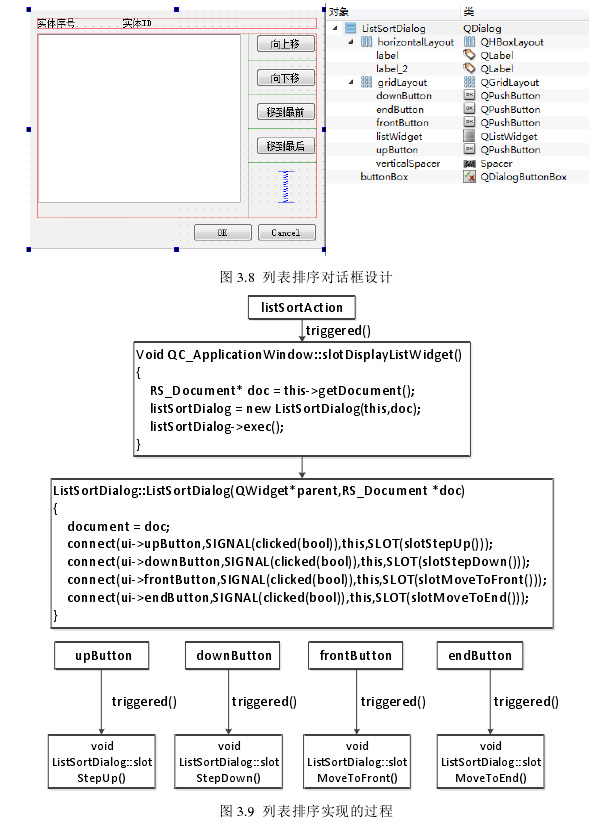 列表排序,即一次可以对多个实体同时进行操作。首先要进入实体排序状态,单击“列表排序”按钮,弹出列表排序对话框,选择实体序号,然后点击“向上移”按钮,或是“向下移”按钮,或是“移到最前”按钮,或是“移到最后”按钮,最后点击“OK”即可。列表排序的对话框及用到 Qt 中的一些组件如图 3.8 所示。对话框中每一种按钮操作的响应都是通过信号和槽来实现的,例如“向上移”按钮,通过槽函数 slot Step Up()来实现整个操作。槽函数 slot Step Up()主要用到函数 swap Entity()(被选中的实体排到指定的位置,并去除原来的),函数 swap()(交换两个数)等,列表排序实现的过程如图 3.9 所示。列表排序前和排序后的效果图分别如图 3.10 和图 3.11 示。