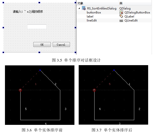 所示。自定义图形实体或是从文件中读取的图形实体都会被存到类RS_Entity Container 中的成员 QList<RS_Entity *> entities 中,通过在类中定义一些函数(方法)获取实体的信息,比如获取容器中的第一个实体指针,最后一个实体指针,给定序号指定的实体指针,因此可以得到当前实体的序号,然后通过 swap Entity(int index,  RS_Entity  *e)函数将被选中的实体指针插到指定的位置,其它的实体指针依次后移一个位置,并去除原来实体指针。单个实体排序的对话框及用到 Qt 中的一些组件如图 3.5 所示。单个实体序号 排序前和排序后的效果图分别如图 3.6 和图 3.7 所示。