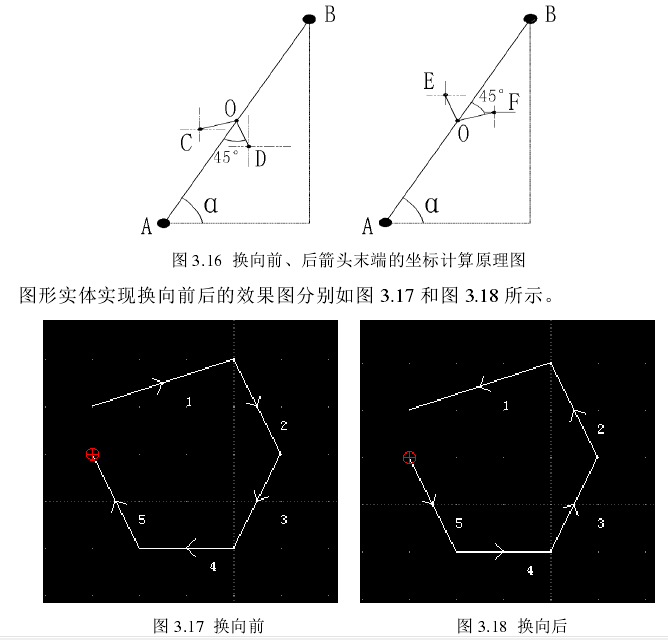 对于每一个实体(直线,圆弧,圆,椭圆,polylinepolygonspline 等),在自定义创建图形实体时或是从二维图形文件(CAD 保存的.dxf 文件)中读取图形实体时,实体方向是任意的,此时,用户可以根据自己的需要修改实体的加工方向。选中实体,可修改其加工方向(即切割的进给方向)。如可以将图形实体绘图终点作为加工起点,由绘图终点运动到绘图起点。对于不是封闭的图形如直线、圆弧,图形实体换向主要是将起点与终点互换,而对于封闭的图形,如圆、椭圆及 polyline 等,图形实体换向主要是定义一个标志换向的变量,然后再在具体画箭头的函数中来实现箭头的换向。在这里,具体说明直线换向和箭头实现的过程。