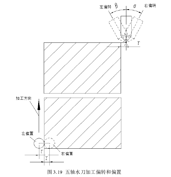对于五轴水刀切割加工而言,它相对于三轴多了角度偏转的问题。水刀切割的工艺参数主要有左偏转、右偏转、偏转角度、左偏置、右偏置、偏置半径、进给速度等,其中工艺参数偏转和偏置描述简图如图 3.19 所示。CAD 模块中有点、直线、圆弧、圆、椭圆polylinepolygonspline 等实体种类,这些几何实体图形在绘制中保存时只是存储了点的坐标、图层及块等概念,然而没有将具体加工这些图形时所需的水切割加工工艺参数设置并保存。这些实体类型不但具有各自的特征,而且还具有共同的特征,所以先建立一个基类,存储共有的属性及行为操作,然后再从基类派生出这些不同种类的子类实体类型,存储各自特有的属性和行为操作。水刀切割加工工艺参数就属于这些实体共有的特性,因此在它们的基类中定义结构体数据: