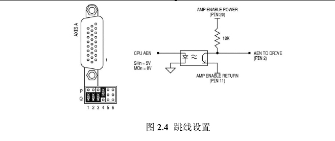 DMC-4080提供的放大器使能方式有:高电平放大器使能(HAEN、低电平放大器使能(LAEN ) ,  5 V逻辑、 12V逻辑、24V的外部电源等。每轴放大器使能电路可通过跳线分别设置的,每个不同配置的跳线设置和电路图如图2.4所不。