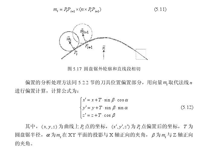 线段相切。如图5.17所示,在加工第i条直线段PiPi+1时,圆盘锯向与直线段垂