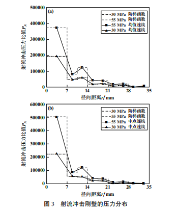 选定140mm靶距,下图为试验获得的在不同系统压力下纯水射流和磨料射流冲击刚壁压力随径向距离变化关系(多次试验的平均值)由图可知,随径向距离增加,在1阶冲击力值(偏离中心位置7mm)后,冲击压力急速降低,是一非单调递减的阶梯函数,连接各阶中点位置,可视其为具非单调负指数下降规律(负指数函数和低幅谐波函数的叠加),而非切割小口径喷嘴射流形成的近似高斯分布规律。压力急速下降的负指数关系是由于射流在冲击区沿径向改变方向后射流速度的耗散,导致非单调下降的低幅谐波变化尚待进一步的理论和试验研究。系统压力增加,射流压力增加,呈正相关变化关系,但对射流压力的总体分布规律影响很小,磨料射流呈除相应的冲击压力增加外,其分布规律基本有纯水射流一致。