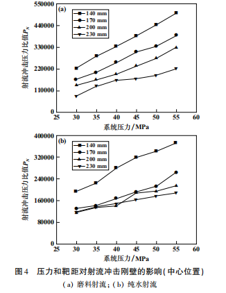 下图给出了纯水和磨料射流在不同系统工作压力和靶距的情况下,最大冲击压力(中心位置)的比较。