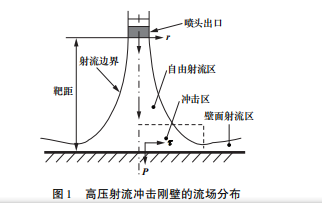 高压射流清理材料表面过程的流场按其流动性分成3个区域,自由射流区、冲击区和壁面射流区,自由射流区内,射流受壁面的影响非常小,因此可以认为该区域的流动性与自由射流相同,在冲击区射流急速改变方向,由轴向流动变为径向流动,并且存在极大的压力梯度。该区域是引起壁面发生弹塑性变形,甚至塑性去除、脆性去除或断裂的集中区域。壁面射流区的流动速度减弱,而且相对平稳,因此一般不会发生避免材料变形或去除。