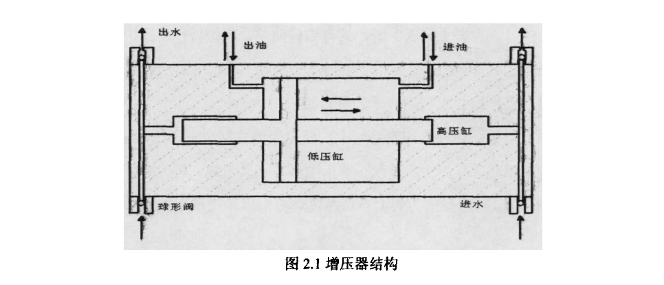 1)增压器的增压过程:低压油通过导油孔进入往复式增压器低压油缸中低压腔的一侧,推动活塞体进行运动,进而使一端高压腔的压力升高,从而使此端高压腔内的水形成高压水后,进入稳压器内。当活塞运动到接近油缸端头时触动触发器,与该触发器相连的行程开关传感器被激发,发出信号控制换向卿换向供油,使活塞向相反的方向运动。如此反复,此换向阀使增压器低压油缸的左右两端油孔周期性排油与供油,从而驱动增压器的活塞组往复运动。其具体结构如a.1图所示: