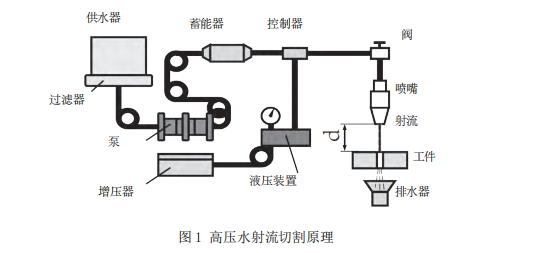 高压水射流切割技术,是利用高压水发生设备产生高压 水,通过喷嘴将压力能转变为高度聚集的水射流动能,用这 种射流对物料进行切割、破碎和清洗。其中对材料的切割和破碎,主要是利用漩涡水射流的刚性;而对材料的清洗,更 多的是对水射流的柔性。现代的水切割技术,通常和数控技 术集成,构成数控水切割机床,由数控系统操纵水刀,完成 复杂轨迹的切割。高压水射流切割原理如图 1 所示。